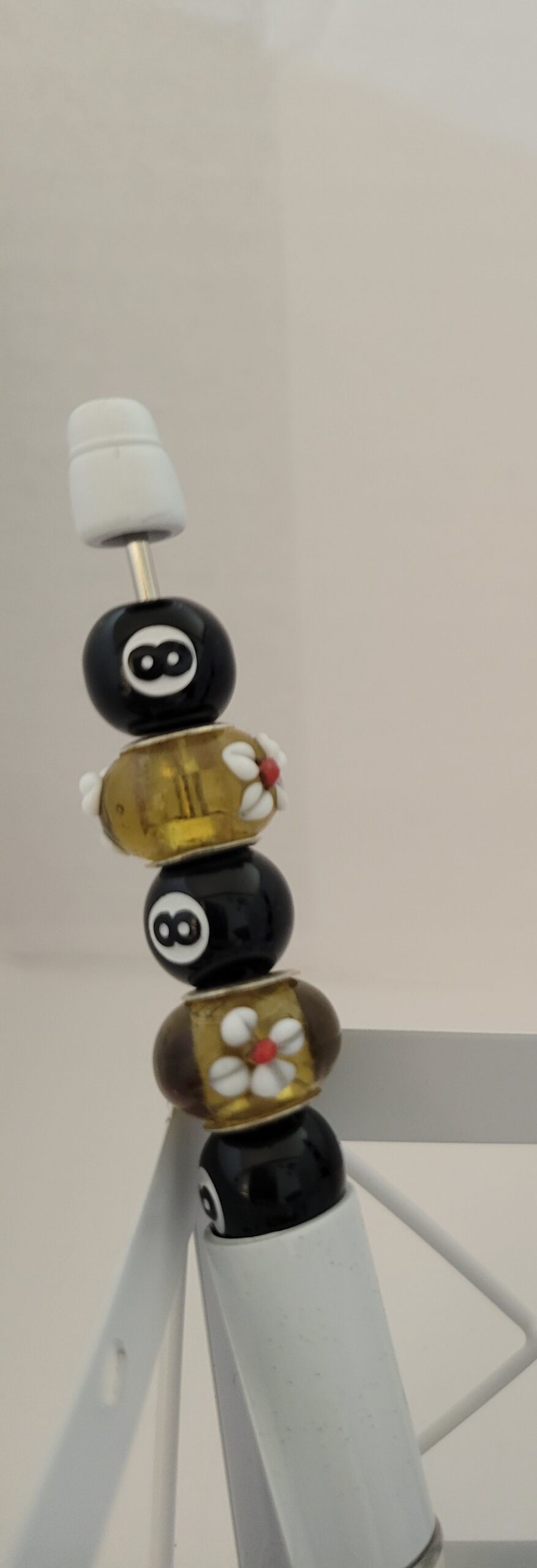 Write in your pool journal with this gold and flower beaded 8 ball pen