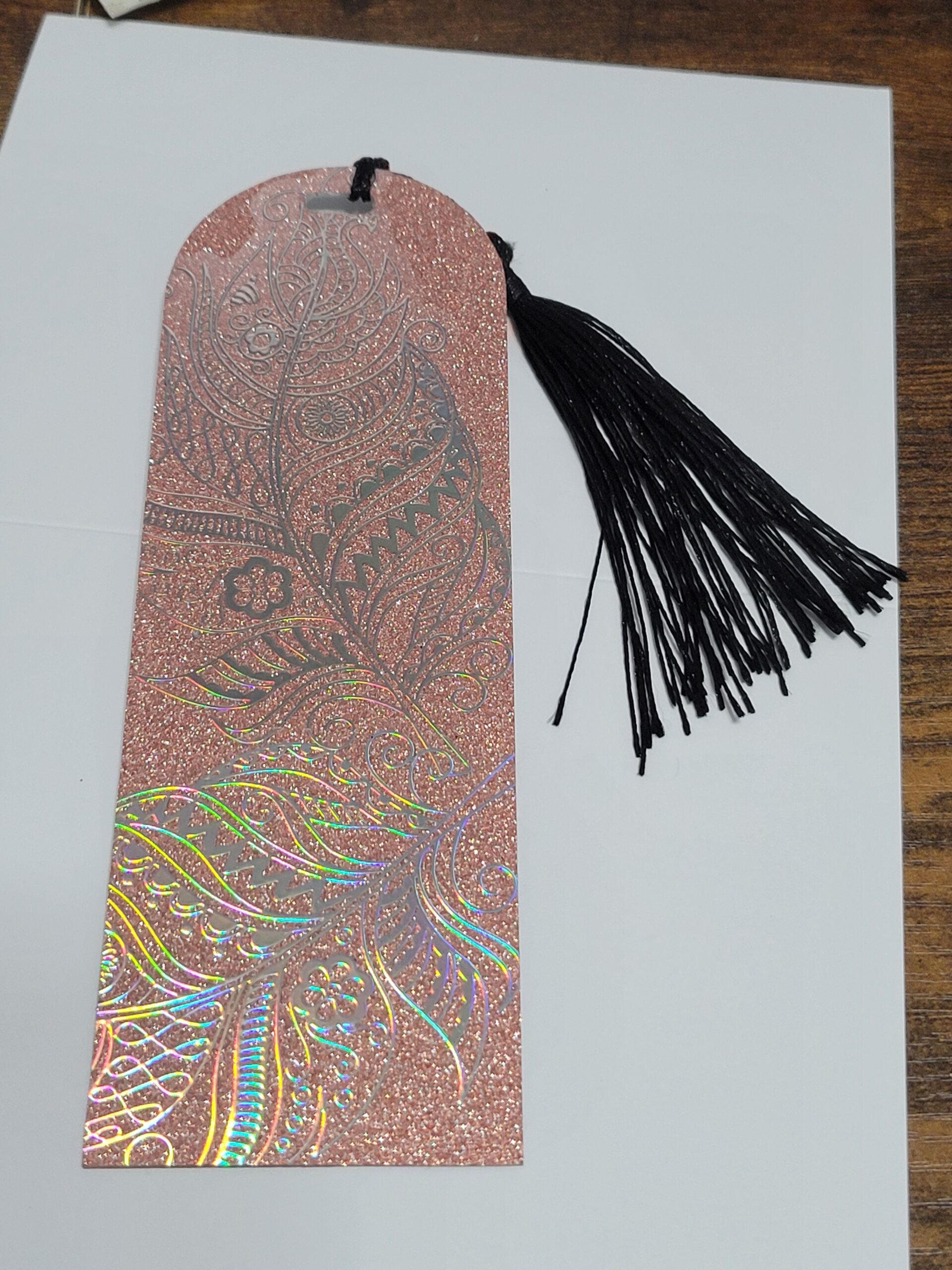 This gorgeous pink Acrylic Bookmark with rainbow colored feathers needs a new book.