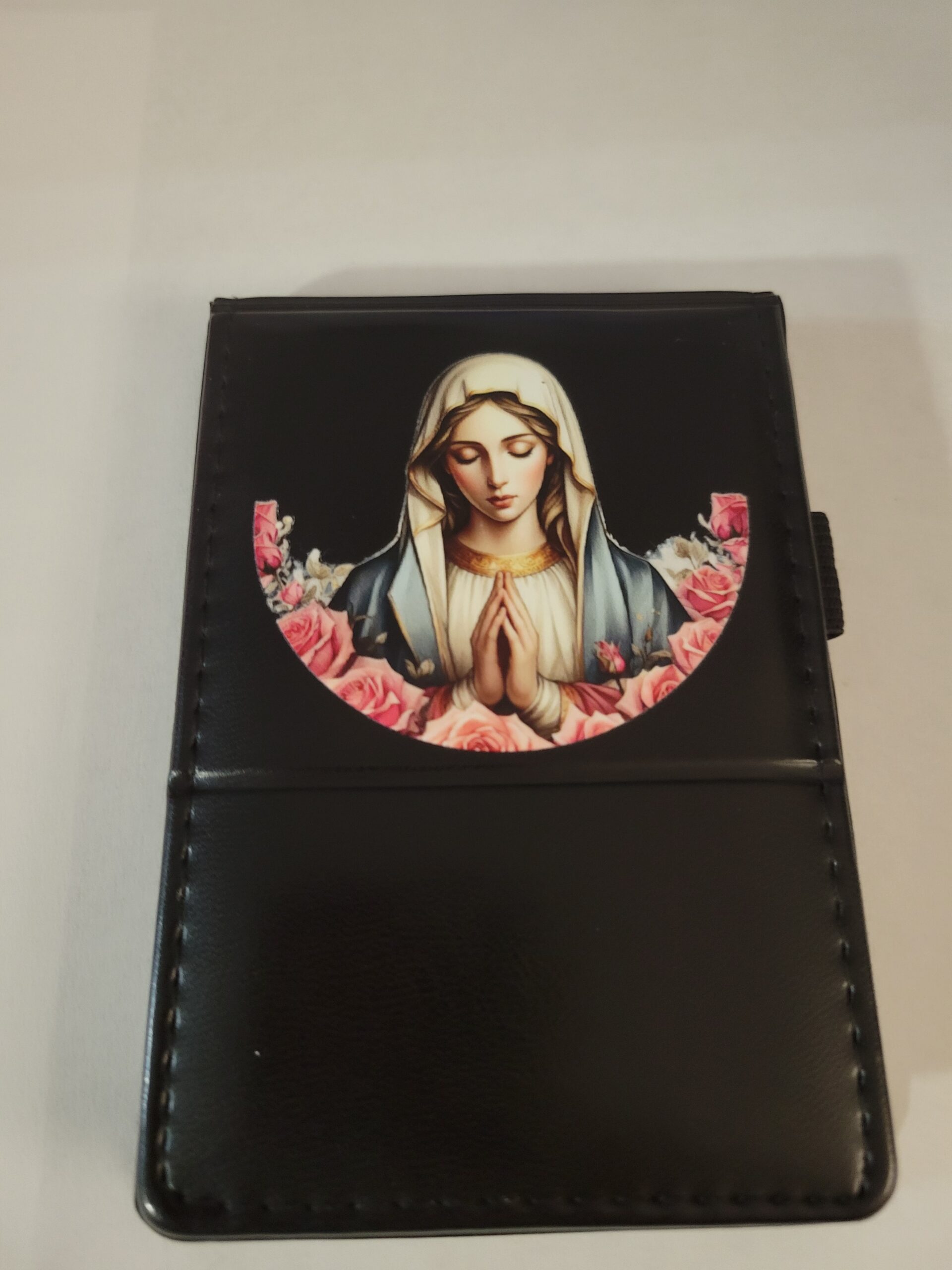 Small Black Leather Notebook with Mother Mary and Silver Pen