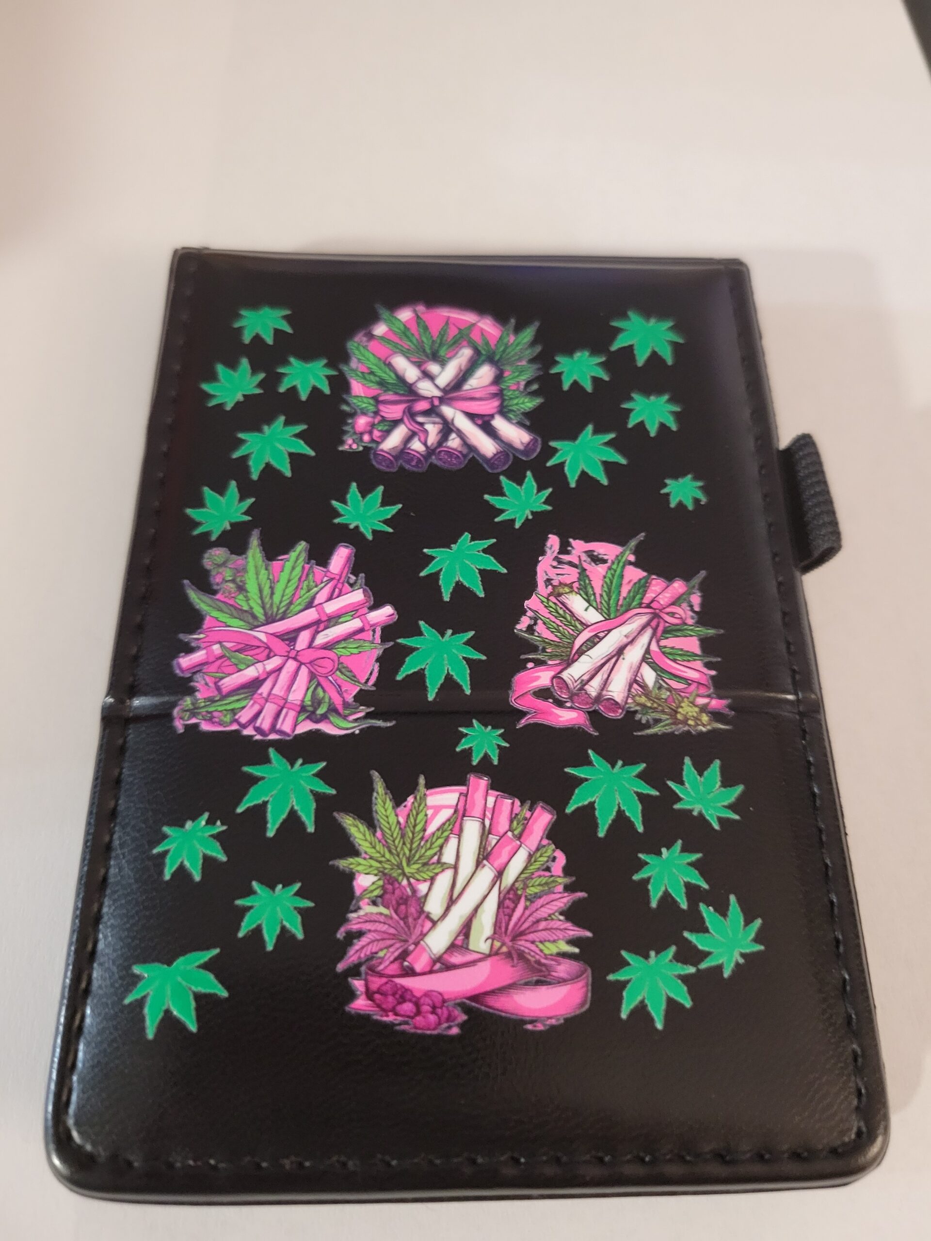 Small Black Leather Notebook with Weed Leaves and Silver Pen (no lines)