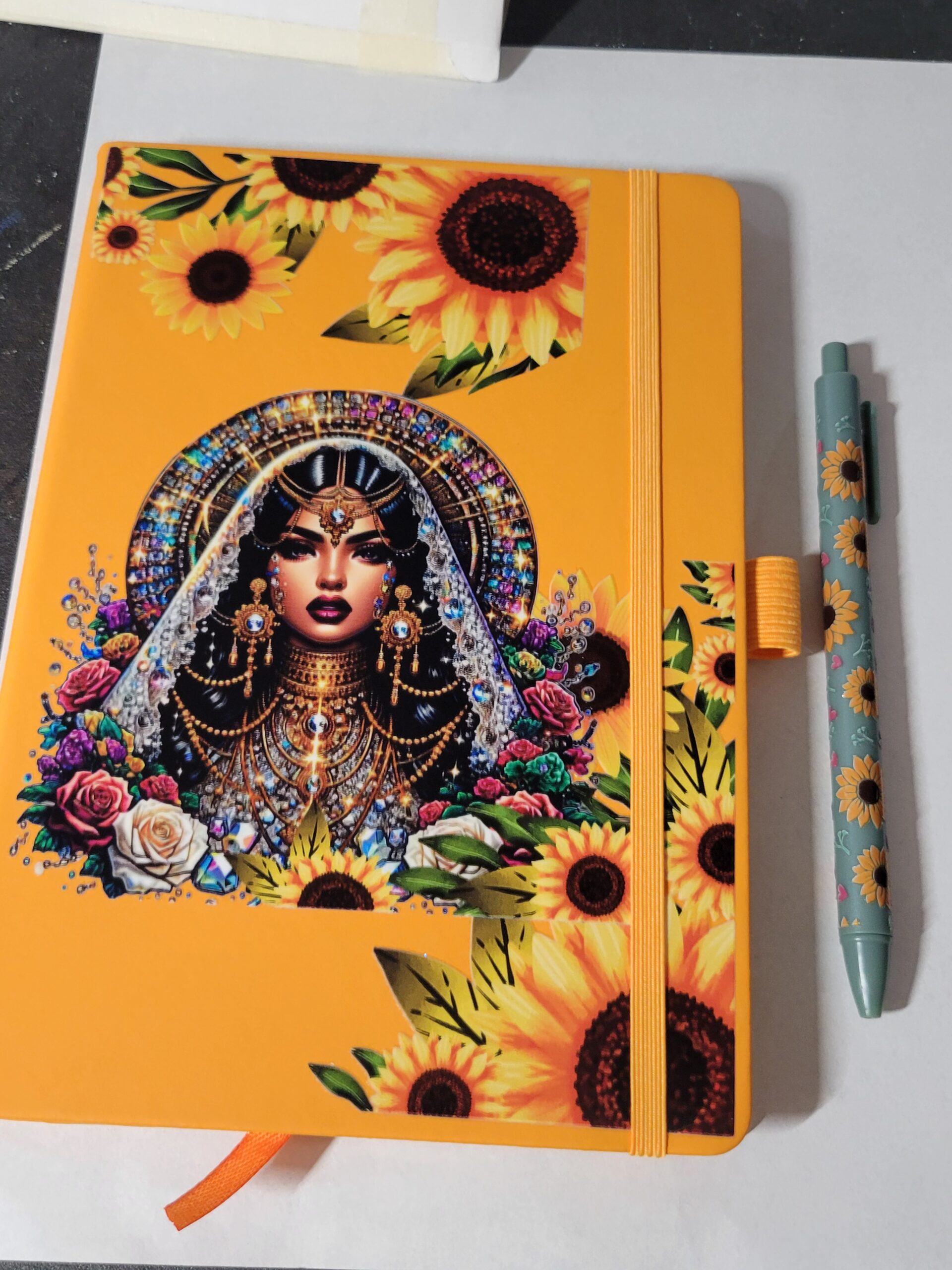 Yellow Leather Notebook with Sunflowers and Purple Pen